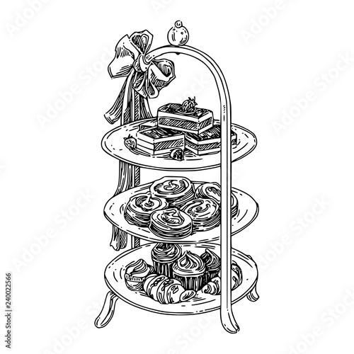 Afternoon Tea High Stand With Sweets Sketch Engraving Style